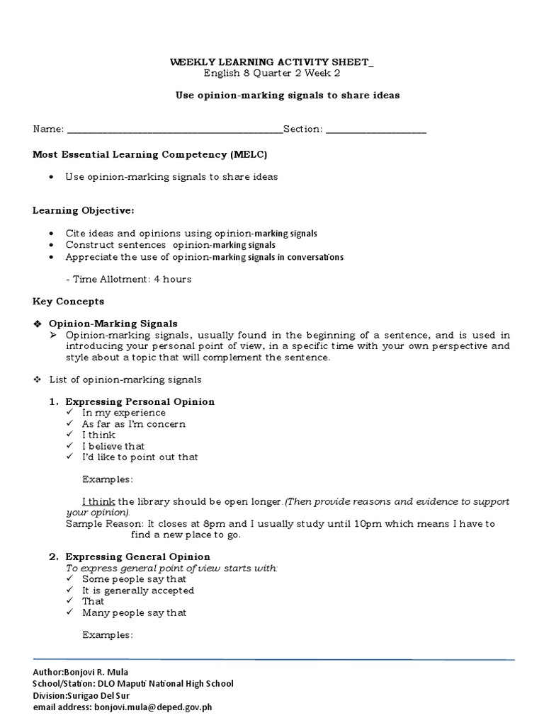 3 How Did The Opinion Marking Signals Serve As Guide In Your Reading Brainly Ph from ph-static.z-dn.net In sharing opinions, we can used these signal words or phrases to connect our ideas logically, yes. Here are 5 examples of opinion marking signals: Mayt4u (mechanical) 26 mar 07 21:59. This is a lesson plan on identifying opinions using signal words. It begins with identifying key components of a conclusion, then offers valuable writing practice of summarising key points, restating a thesis and creating ideas for a future focus. Видео english 8 quarter 2 week 2: Learn vocabulary, terms and more with flashcards, games and other study tools. Grade 8 opinion marking signals examples :